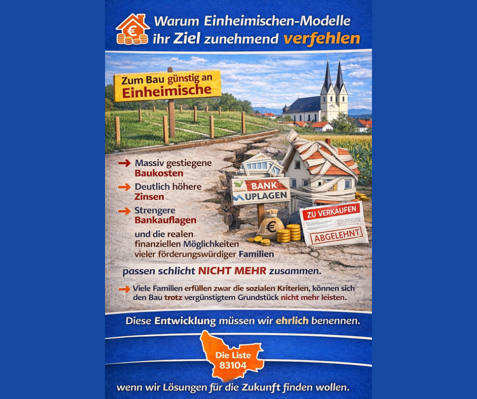 Einheimischen-Modelle mit vergünstigten Grundstückspreisen sind gut gemeint. Doch die Realität zeigt immer häufiger: Sie wirken nicht mehr so, wie sie sollen. Warum?: Die Bewerbungsrunden zeigen: 👉 Viele Familien erfüllen zwar die sozialen Kriterien, 👉 können sich den Bau trotz vergünstigtem Grundstück nicht mehr leisten. Das Ergebnis: Die Angebote greifen nicht mehr – und verfehlen ihr eigentliches Ziel,…