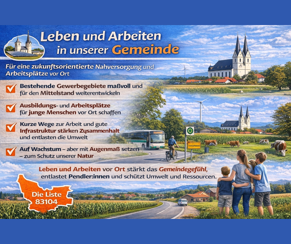 Wer in unserer Gemeinde lebt, soll – wenn möglich – auch hier arbeiten können. Wir wollen:→ bestehende Gewerbegebiete sinnvoll weiterentwickeln→ neue Flächen für Klein- und Mittelstandsbetriebe maßvoll schaffen Aber klar ist auch:Wachstum ja – Flächenfraß nein. Unsere ländliche Struktur, unsere landwirtschaftlichen Betriebe und unsere Natur müssen erhalten bleiben. Wirtschaftliche Entwicklung darf nicht zulasten unserer Identität gehen.…