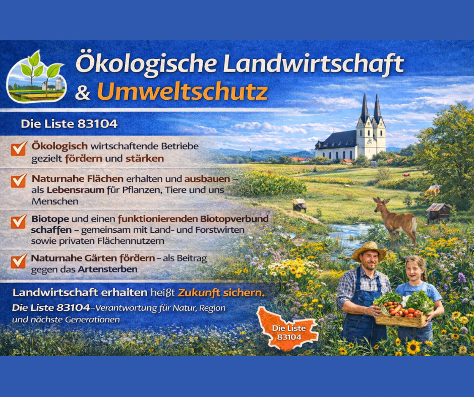 Unsere Landwirtschaft prägt unsere Gemeinde –unsere Felder, unsere Landschaft, unsere Identität. Wir stehen für eine zukunftsfähige Landwirtschaft,die unsere Böden, unsere Tiere und unsere Gesundheit schützt. Was wir konkret wollen: 🔸 Ökologisch wirtschaftende Betriebe gezielt fördern und stärken 🔸 Landwirtschaftliche Flächen vor unnötigem Flächenverbrauch schützen 🔸 Naturnahe Flächen erhalten und ausbauen –als Lebensraum für Pflanzen, Tiere und uns Menschen 🔸 Gemeinsam…
